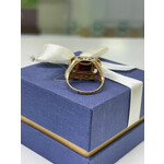 Золотое кольцо с магическим гранатом и небольшими фианитами. Камень надежно закреплен в крапановой оправе, который позволяет просматривать его со всех сторон. Большие размеры кольца передают роскошь и вызывают восхищение.