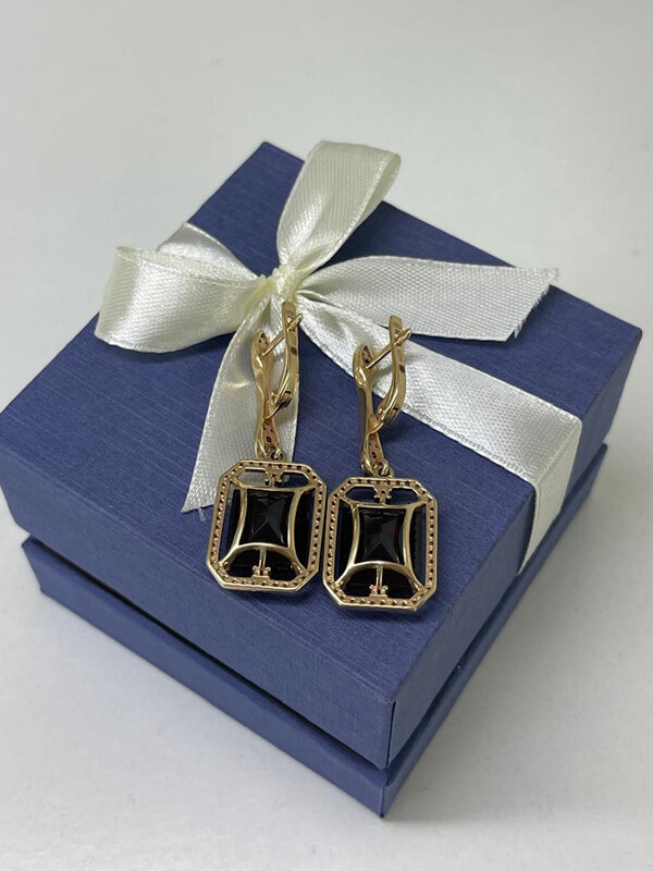 Шикарные серьги выполнены из жёлтого драгоценного метала 585 пробы с большими гранатами в окружении сияющих фианитов.Свое название камень заслужил своим цветовым сходством с зёрнами плода граната.Золотые серьги соединили в себе роскошь и утончённость.Камень гранат отлично подходить для загадочных и решительных женщин, также серьги идеально сочетаются с вечерними нарядами.