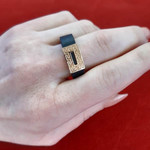 Кольцо изготовлено из золота 585 пробы красного цвета, прекрасно дополняется черным каучуком и имеет греческий орнамент — это мужское украшение, которое показывает стиль, элегантность и хороший вкус мужчины. Такое изделие несомненно будет привлекать внимание и вызывать интерес. Кольца из каучука долговечны, практичны и всегда актуальны, кроме того они подойдут под любой классический или повседневный наряд.