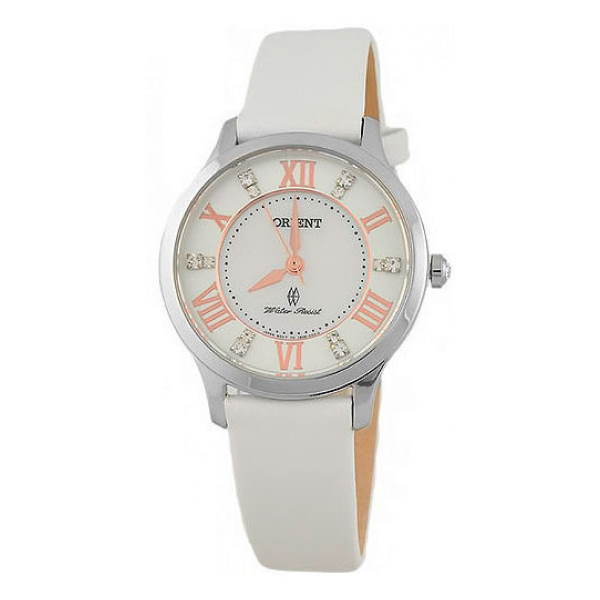 Современные кварцевые часы ORIENT диаметром 30,5 мм в корпусе из нержавеющей стали, с классическим белым ремешком и белым текстурированным циферблатом. Изысканной элегантности часам придают привлекательные золотисто-розовые стрелки и римские цифры, чередующиеся с часовыми метками, в которые инкрустированы кристаллы Swarovski. Модель UB9B005W защищена сапфировым стеклом и обладает водостойкостью до 30 метров.