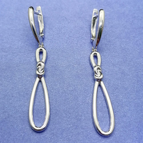 Серьги выполнены из серебра 925 пробы. Вставок не имеют, но это абсолютно их не портит. Обладают оригинальным и лаконичным дизайном. Пикантной деталью является узелок, который сразу притягивает взгляд, появляется желание рассмотреть серьгами поближе. Стильные и завораживающие. Отлично сочетаются с повседневным стилем, офисным или романтическим образом. Можно использовать в комплекте с подвесом и кольцом. Прекрасный подарок для поклонниц нескучных украшений по-любому случаю
