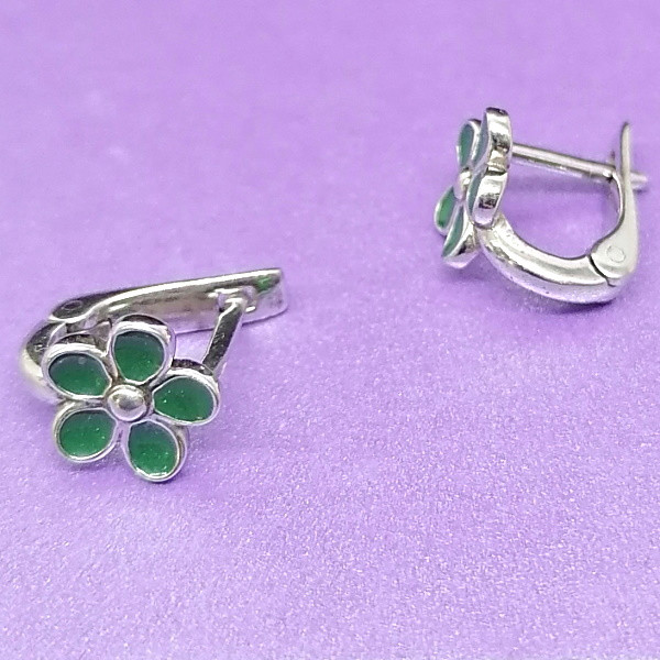 Серьги выполнены из серебра 925 пробы. Инкрустированы эмалью, которая долго будет сохранять насыщенный зелёный цвет. Обладают дизайном в виде цветков. Лёгкие, нежные, аккуратные и очень воздушные. На ушах невесомы и великолепны. Подходят для повседневной носки. Отличный подарок для ребёнка по особому случаю.