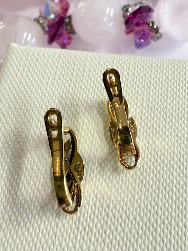 Серьги выполнены из жёлтого золота 585 пробы. Инкрустированы прозрачными фианитами. Аккуратные, лёгкие, изящные, элегантные, изысканные. На ушах сидят просто превосходно. Сочетаются с любым стилем одежды. Образ можно дополнить подвесом и кольцом. Прекрасный подарок девушке/женщине по-любому случаю.