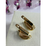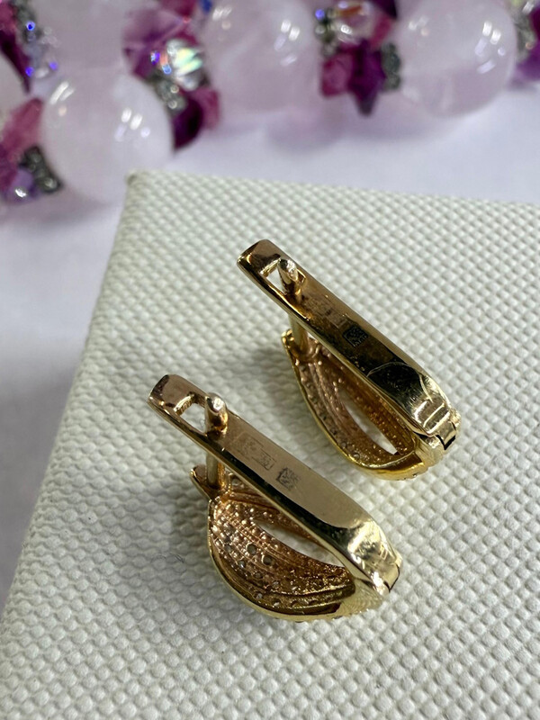 Серьги выполнены из жёлтого золота 585 пробы. Инкрустированы прозрачными фианитами, которые блестят на солнце, как бриллианты. Дизайн выполнен в виде листочков. Стильное, элегантное, изящное и очень яркое украшение. Сочетается с повседневным, вечерним и спортивным стилем одежды. Образ можно дополнить подвесом и кольцом. Отличный подарок девушке/женщине по-любому случаю.