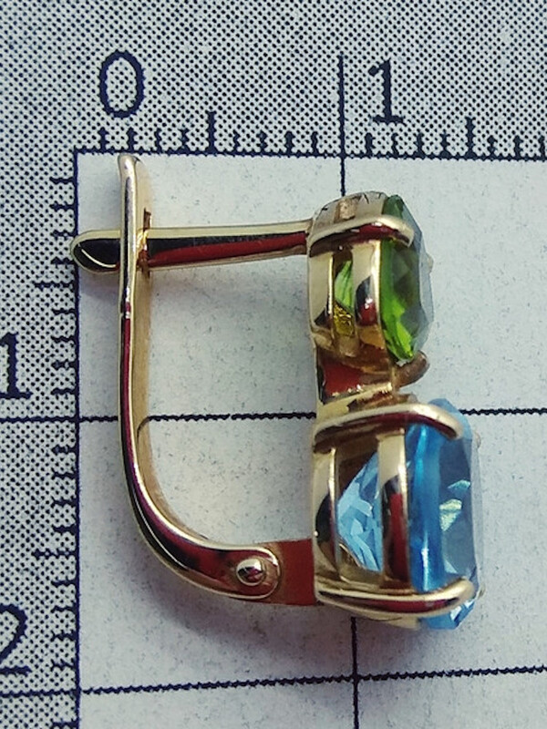 Великолепные серьги из красного золота 585 пробы.В качестве вставки выбран небесно-голубой топаз Sky и яркий хризолит. Данная модель серег имеет английский замок, который давно известен своей надёжностью. Такое украшение подойдет для подарка на знаменательное событие, например юбилей.