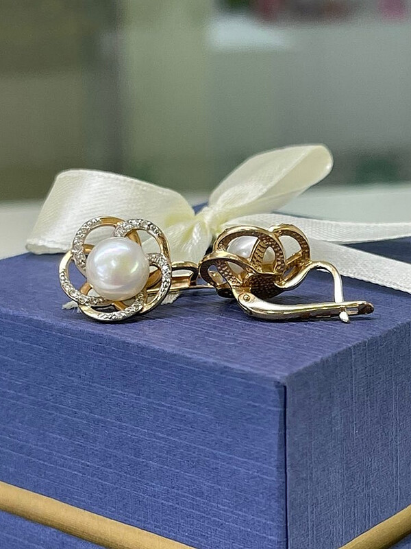 Изысканные серьги выполнены в виде цветка из красного золота 585 пробы. Вставкой служат белый жемчуг и прозрачные фианиты. Изделие оснащено надёжным Английским замком. На ушах модель смотрится эффектно, дорого и очень стильно.