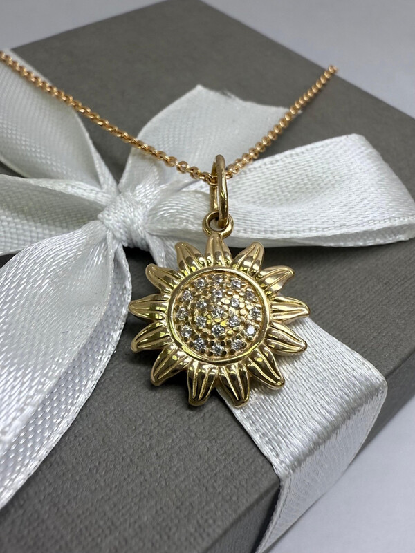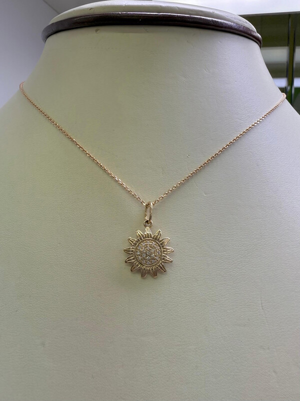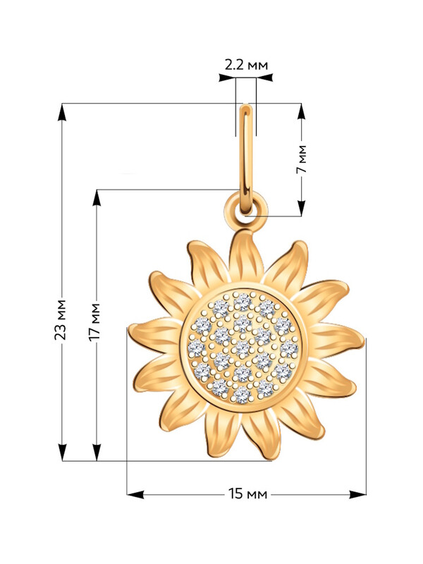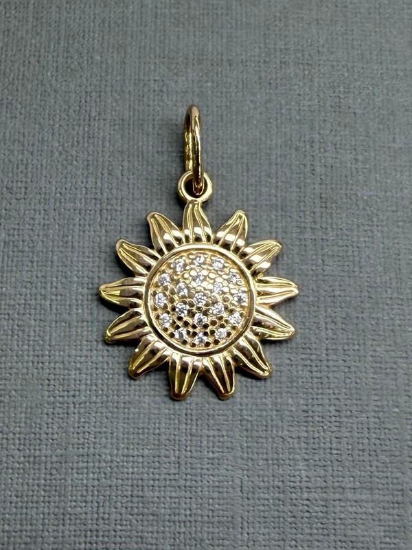 Изящная подвеска в форме подсолнуха, выполненная из золота, украшена сияющими фионитами, которые придают ей мягкое, солнечное свечение. Этот символ радости, тепла и жизненной энергии станет прекрасным акцентом вашего образа и будет ежедневно напоминать о свете и оптимизме.