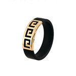 Матово-черный каучук создает эффектный контраст с блеском драгоценного метала, что делает это кольцо удивительно привлекательным. Золотая накладка, выполненная в греческом стиле, добавляет изысканности этому аксессуару.
